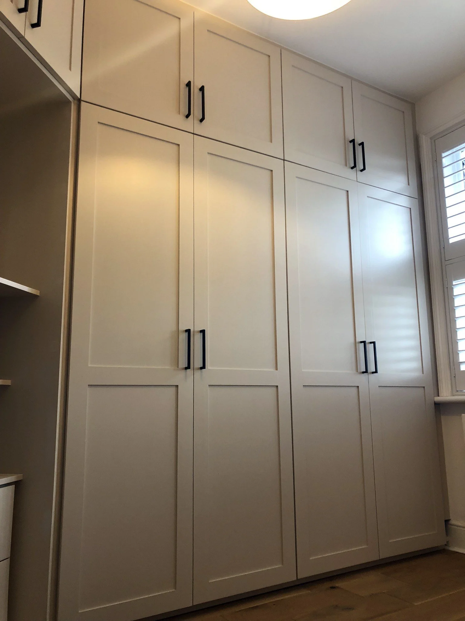 This shelving solution offers storage solutions for rooms with alcoves, where there are walls parallel to each other with a distance no greater than 1800mm. They are constructed using a 2x2 timber frame which is fixed to the wall, then clad in 9mm primed and painted MDF. They can be finished with a range of routed edges or with a simple bevel.